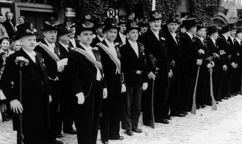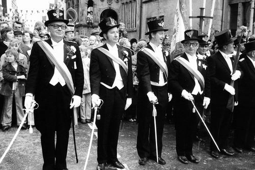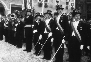 Foto 2: Der neue König (Dr. Herbert Hitzemann) wird von seiner Kompanie nach Hause gebracht. Links: Oberleutnant Heinrich Brandt. Rechts: Leutnant Wolfgang Siewing.